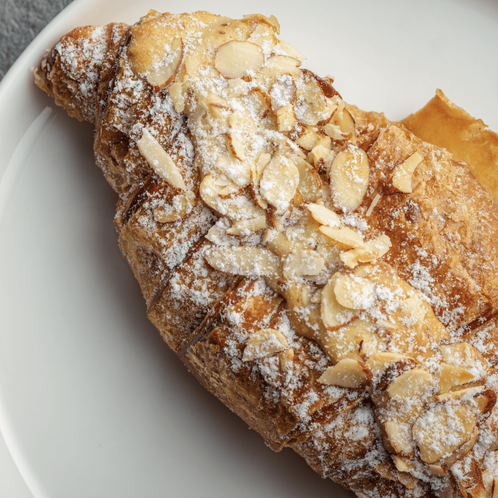 Imagina un croissant de almendras recién salido del horno.