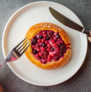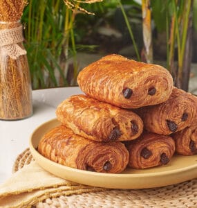 Su exterior es dorado y crujiente, con una capa de azúcar glass ligeramente espolvoreada que le da un brillo tentador. Al partirlo, el sonido de la corteza revela un interior suave y esponjoso, con capas finamente hojaldradas. Dentro, una cremosa pasta de almendras, dulce y con un ligero toque a vainilla, se mezcla con la mantequilla, creando una combinación perfecta de sabores y texturas.