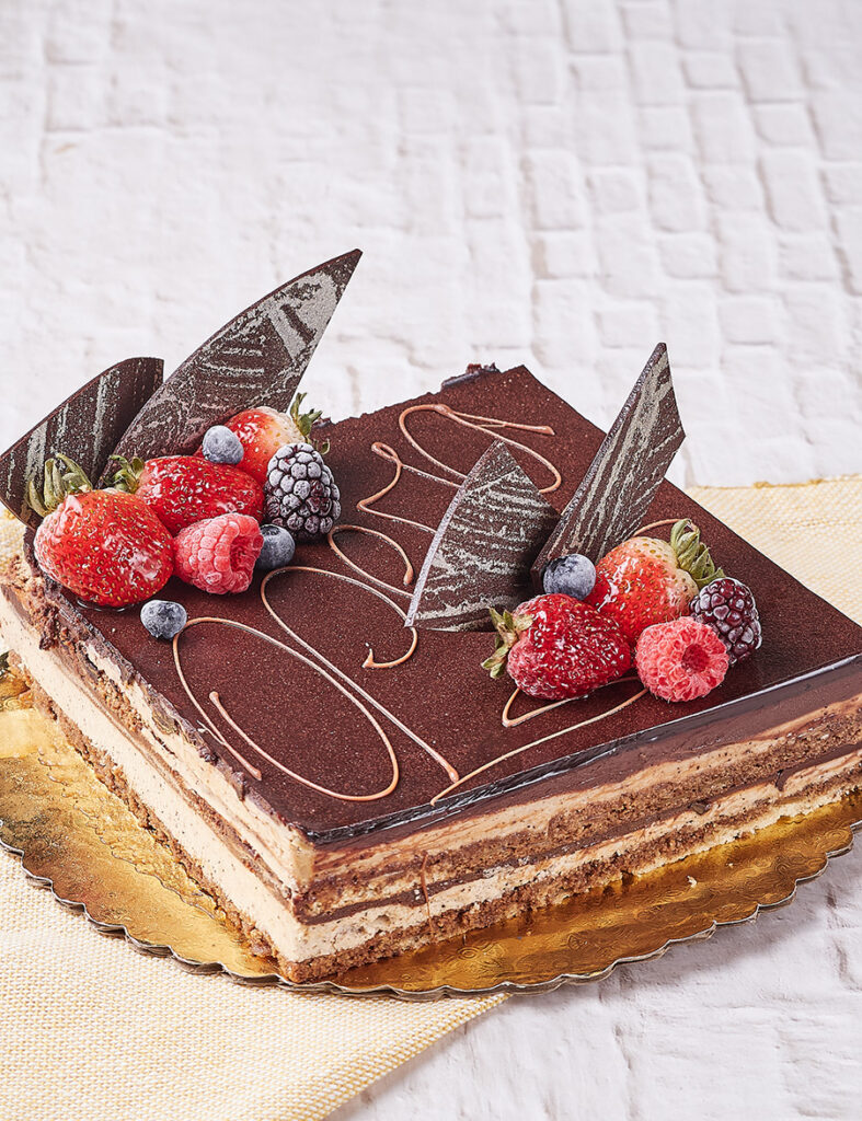 El Opera de Saint Honoré es una exquisita obra de arte dulce, un delicado bizcocho de almendras cubierto con una suave crema de café y una irresistible ganache de chocolate. Perfecto para celebrar los momentos más especiales, cada bocado es una armonía de sabores. El dulce requiere un pedido anticipado de 48 horas para garantizar su frescura y perfección.