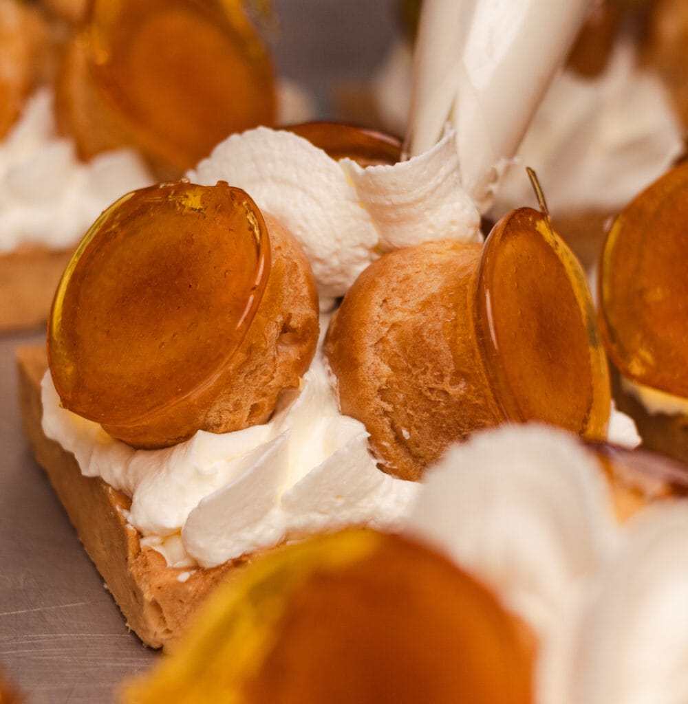 La tarta Saint Honoré debe su nombre a San Honorato de Amiens, el santo patrón de los panaderos y pasteleros. La tarta se compone de una masa de hojaldre, sobre la que se coloca un anillo de pasta choux. En el borde de este anillo, se pegan pequeños profiteroles rellenos de una deliciosa crema .